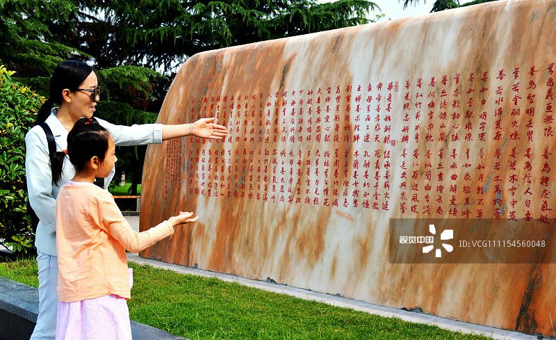 2018年5月26日,邯郸市民在龙湖公园观看《中华善字经》石刻。有河北省邯郸市著名书法家尹飞鹏先生编著,著名书画家李琦先生书写的《中华善字经》石刻,日前落户邯郸市龙湖公园。该石刻高2米、宽6.7米,为整块晚霞红石质,经文600字,其中“善”字就有100个。